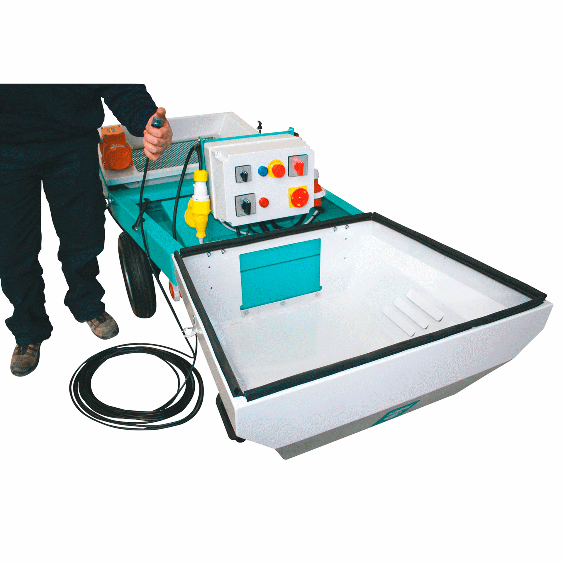 Su diseño compacto permite trabajar cómodamente en obra, facilitando la carga desde hormigoneras o mezcladores continuos sin necesidad de elevación adicional.