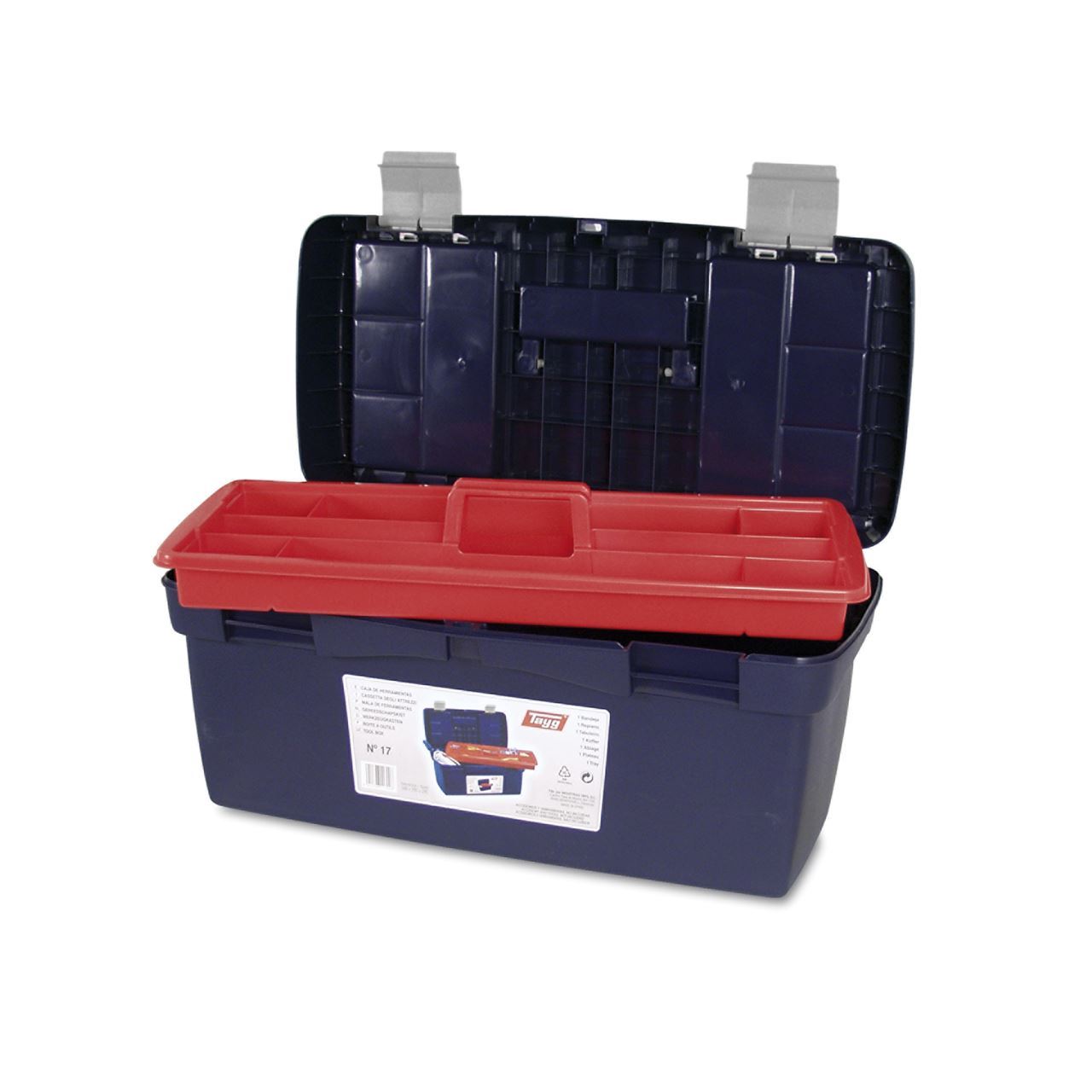 Caja azul de herramientas con cierres metálicos fabricada en polipropileno.