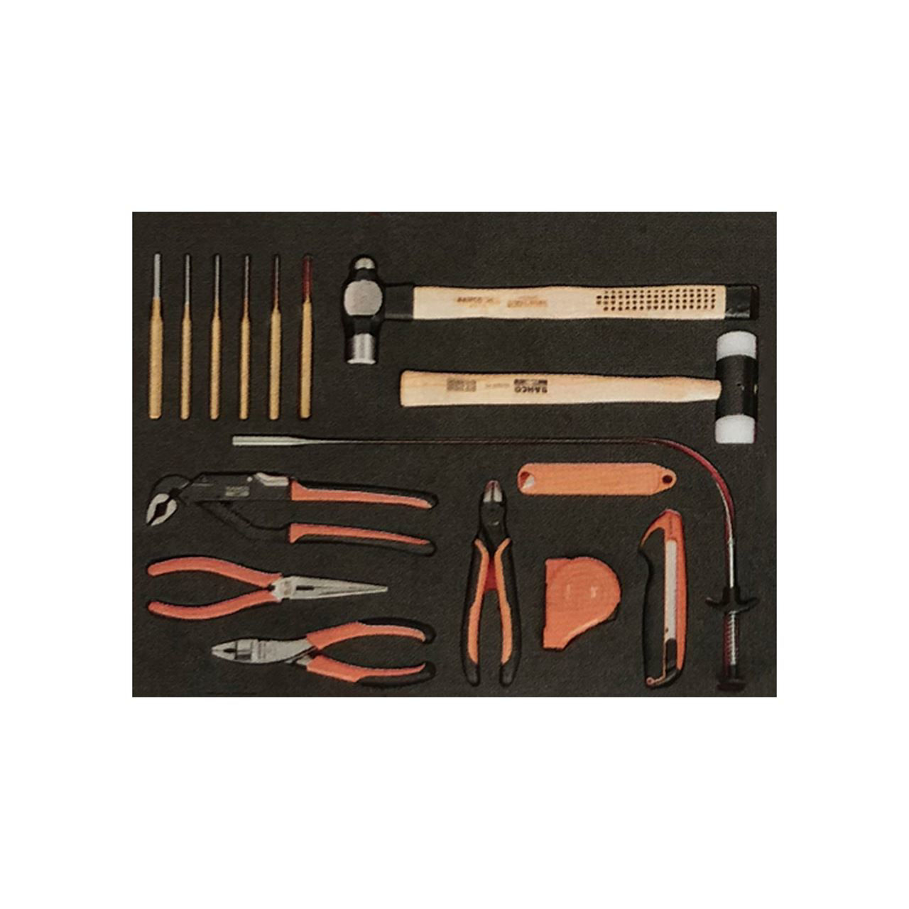 Bandeja de 16 piezas. Bandeja alicaterio y de golpeo con martillos y botadores.