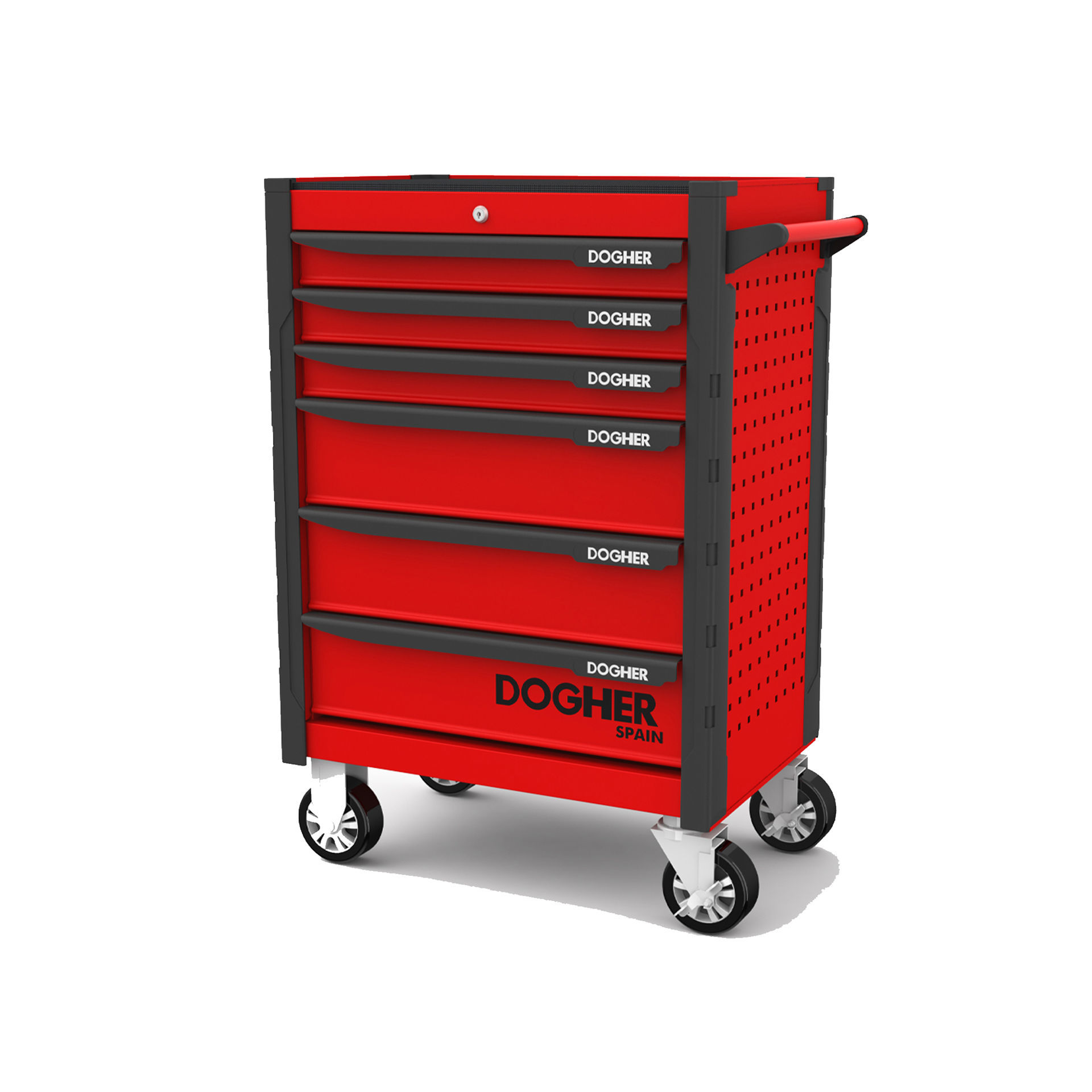 Carro de herramientas Dogher Silverstone de 6 cajones para taller profesional. Carga total 450 kg, cierre centralizado, ruedas con freno y medidas 678 x 459 x 1000 mm.