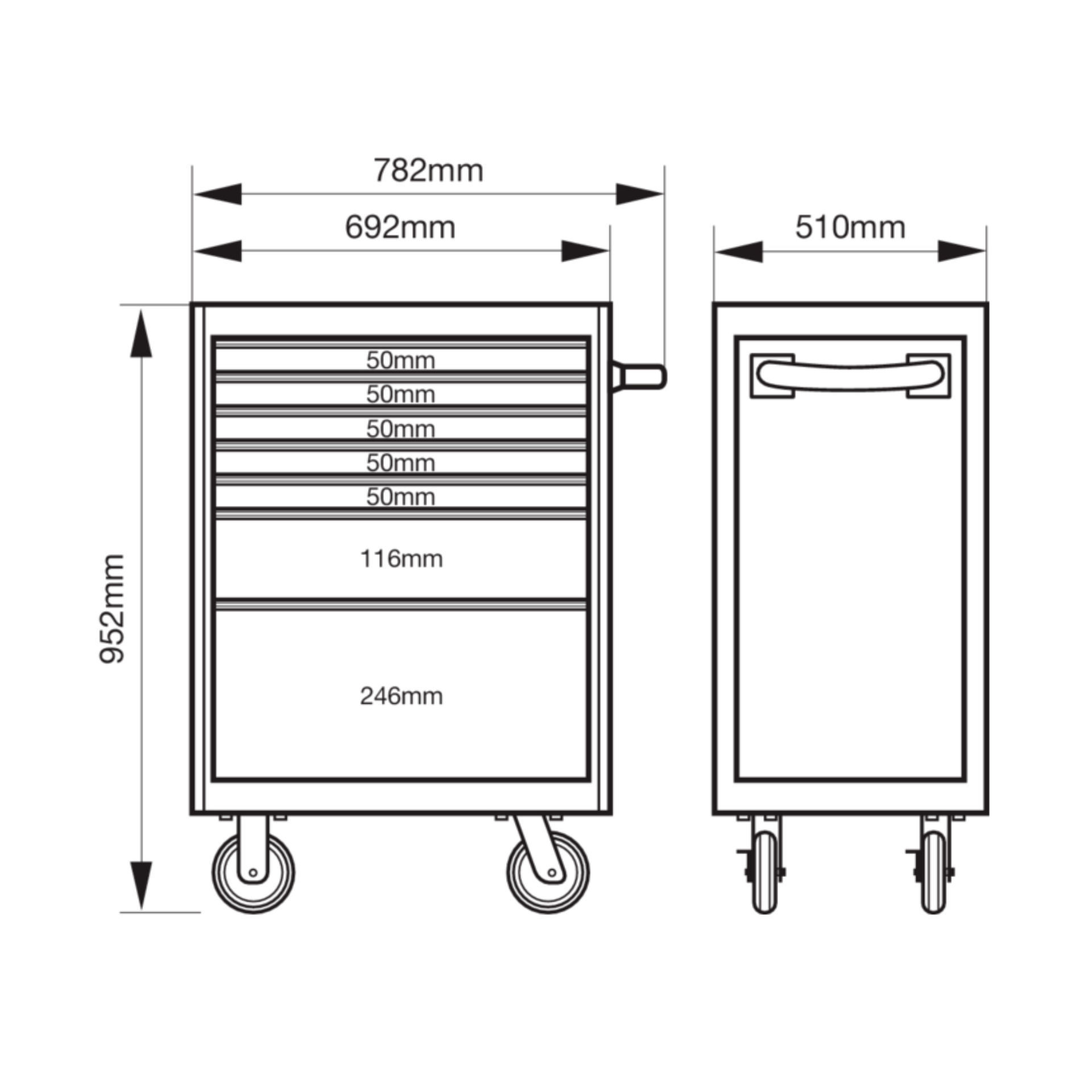 Carro de 7 cajones con chasis de doble pared de acero resistente.
