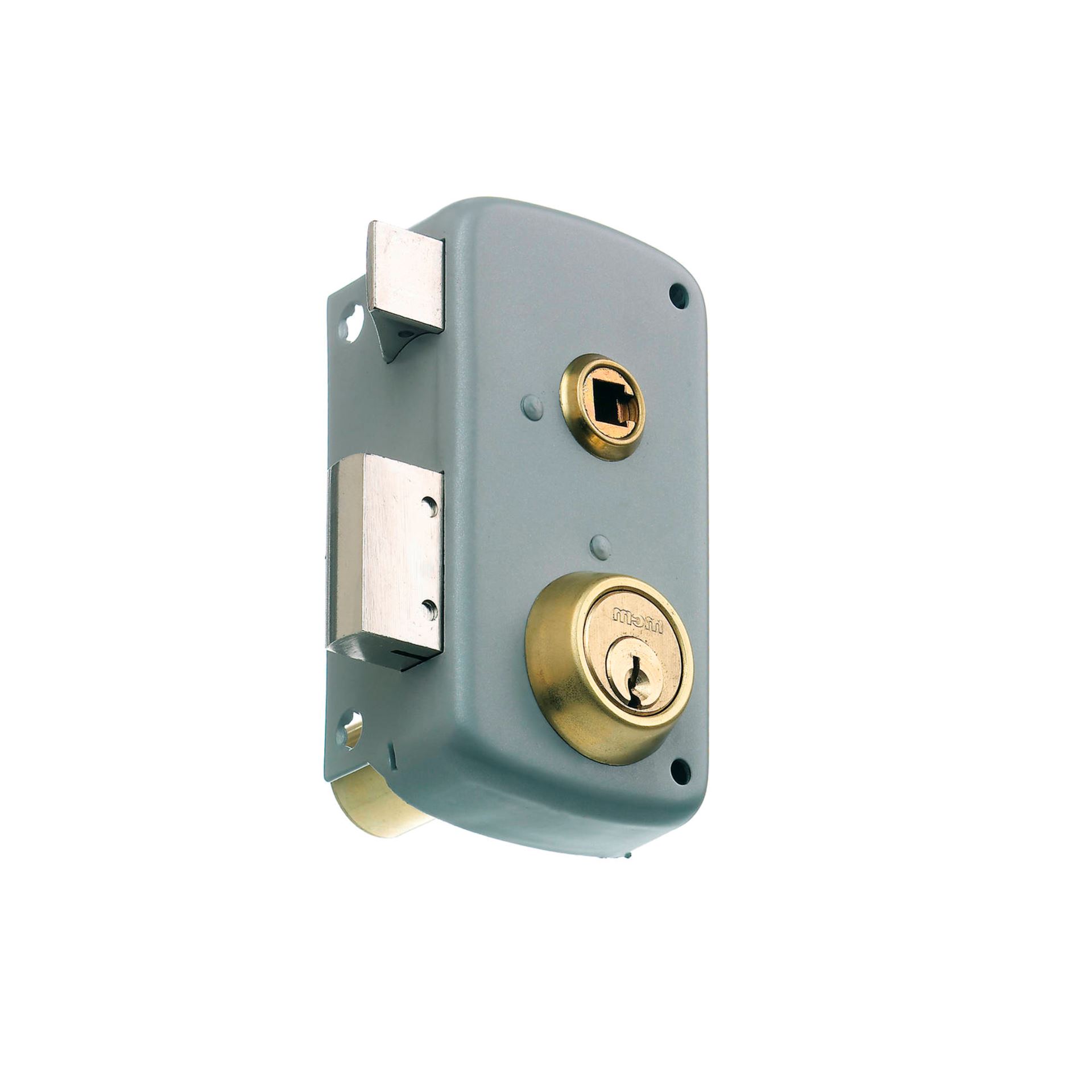 Cerradura de sobreponer con palanca y picaporte de doble cilindro.