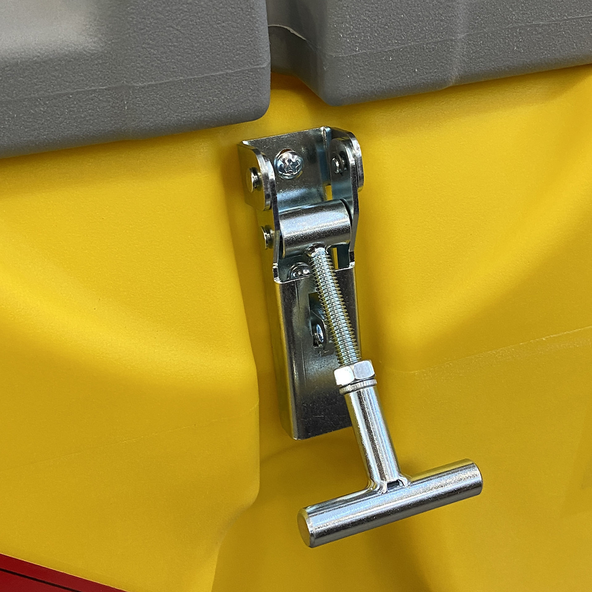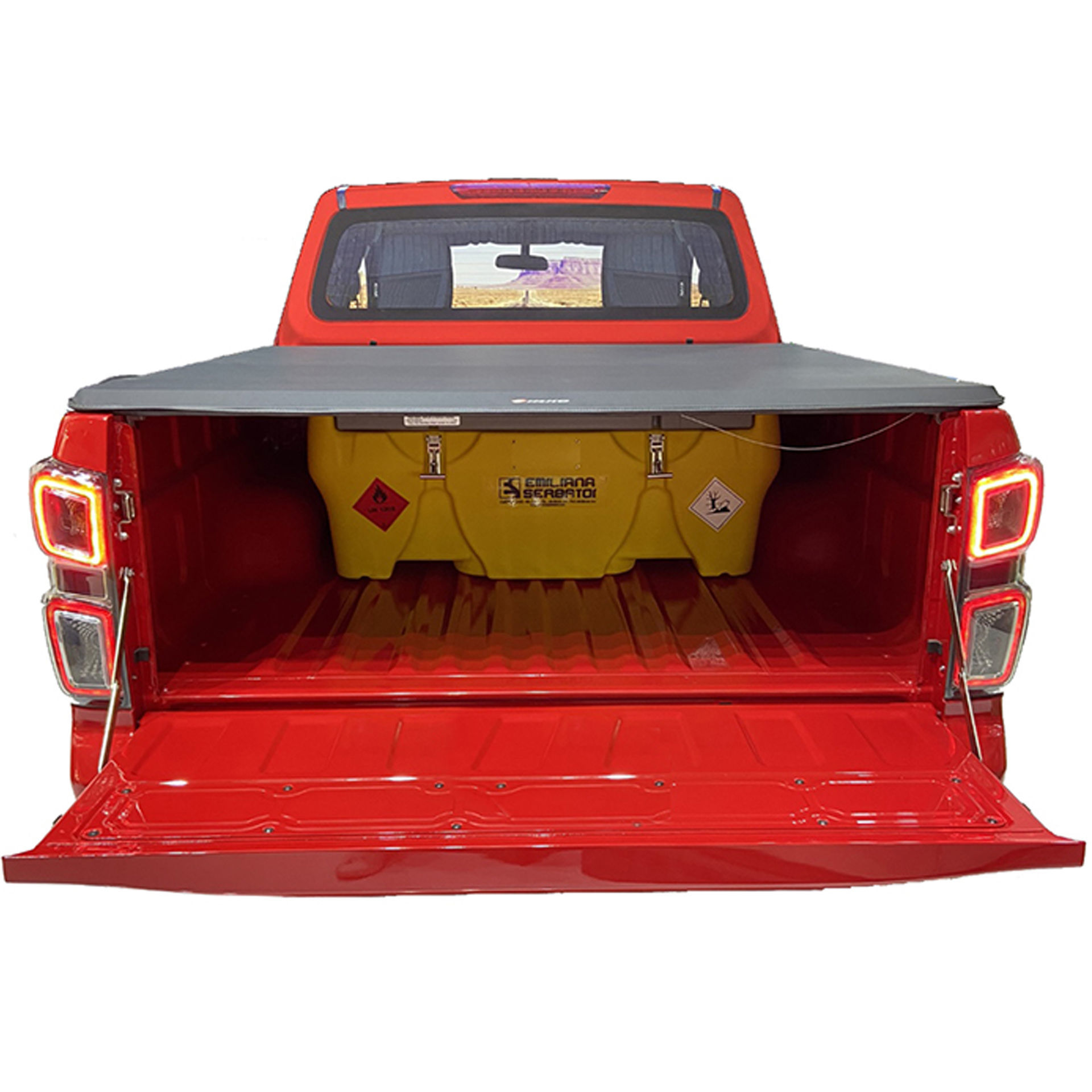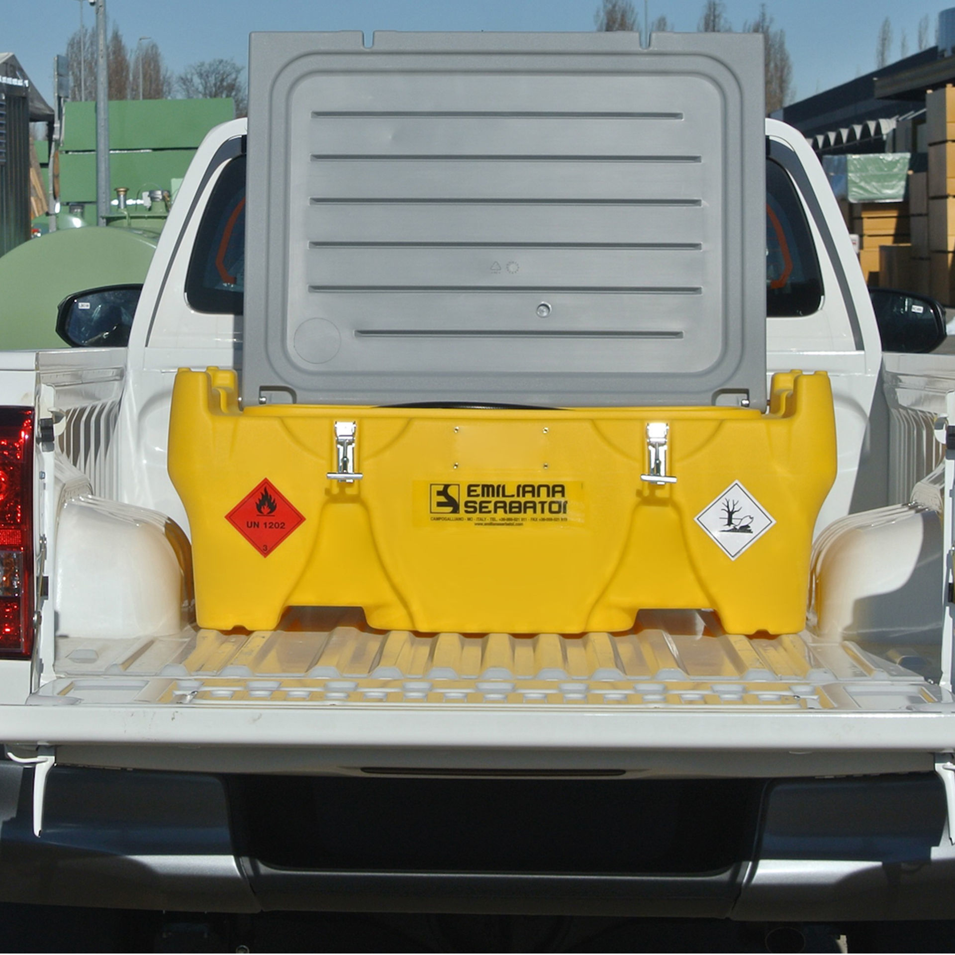 Equipado con: tapa bloqueable con candado y cierre reforzado, tapón de llenado de aluminio, válvula de seguridad, grupo de transvase, orificios para elevación con horquillas a plena carga, asas de elevación en vacío, alojamientos para colocar las correas de fijación en la base de apoyo, indicador de nivel, insertos de aluminio o material compatible con combustible diésel.