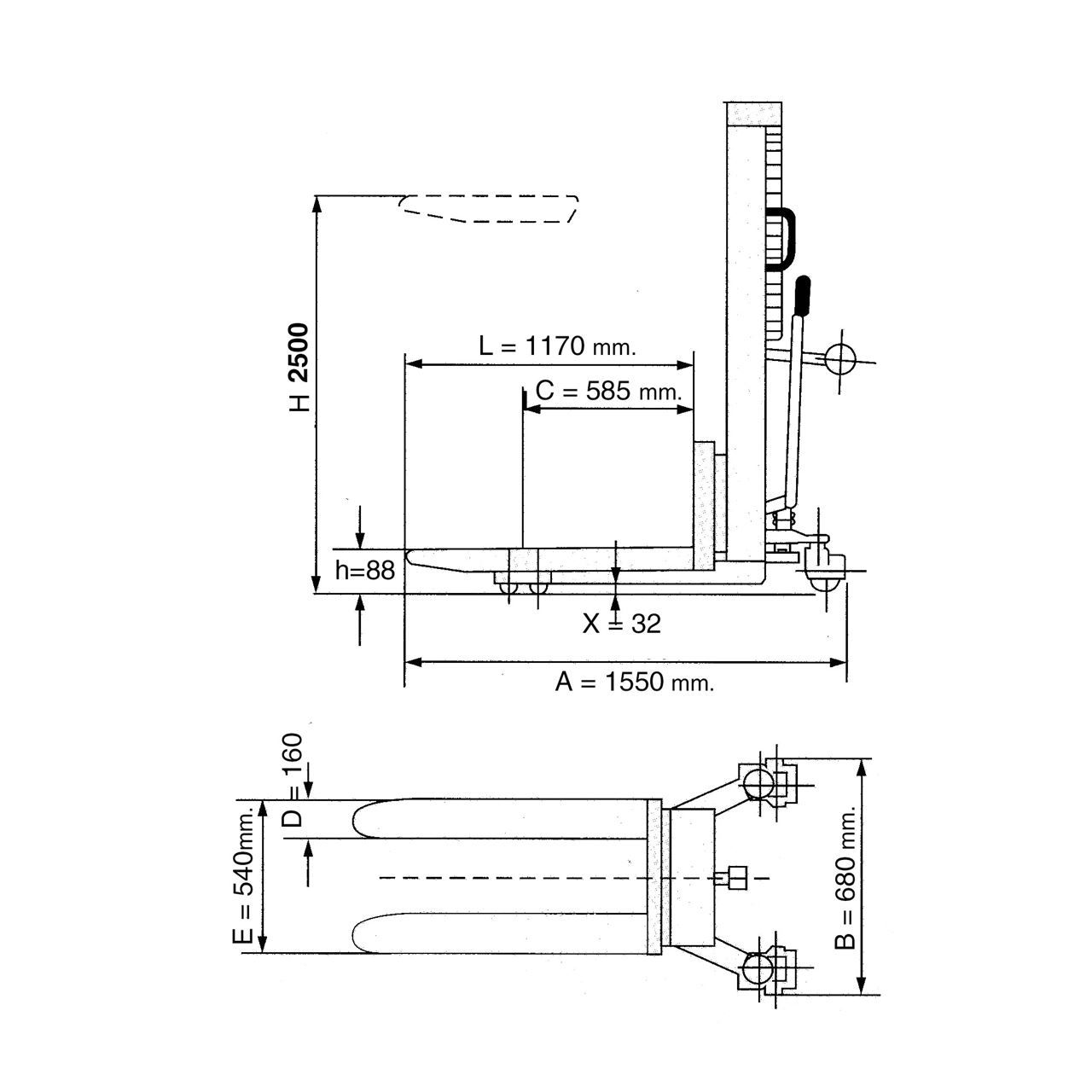 Elevador apilador manual hidraúlico para levantar y transportar cargas hasta 1000 Kg.