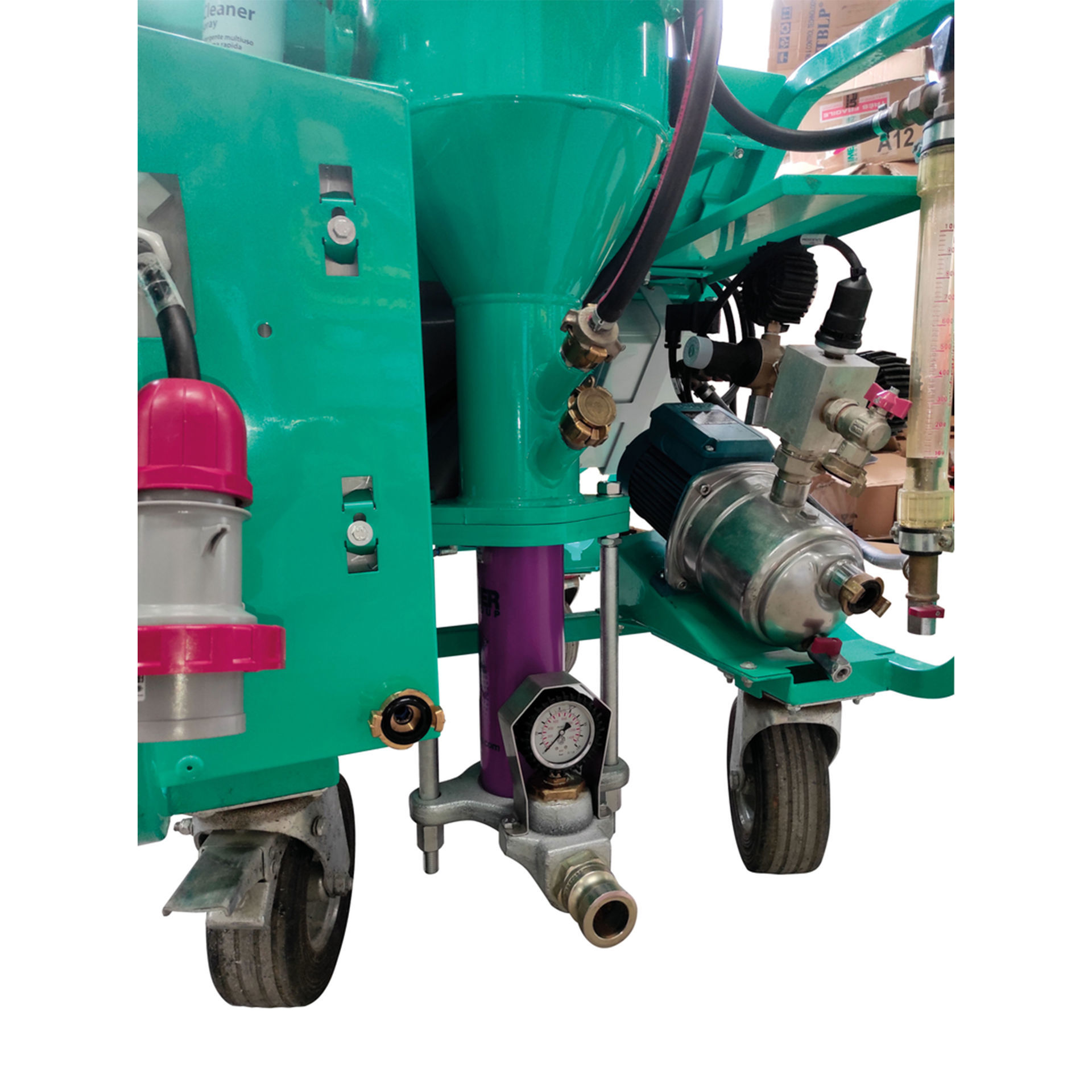 Incluye 20 metros de cable eléctrico de 4 x 5 mm. con clavija 3P+N+T rojo, adaptador de 400 V 32 A trifásico rojo a 230 V 16 A monofásico azul, adaptador de 400 V 32 A trifásico rojo a 230 V 32 A monofásico azul, 40 metros de manguera para el agua, 15 metros de manguera para materiales Ø 25 mm interior, con acoplamiento rápido, 16 metros de manguera para el aire Ø 13 mm interior, con acoplamiento rápido, caja de accesorios con proyector y toberas, rascador y bola de esponja para limpieza de las mangueras de materiales., libro de instrucciones, despiece y Certificado CE.