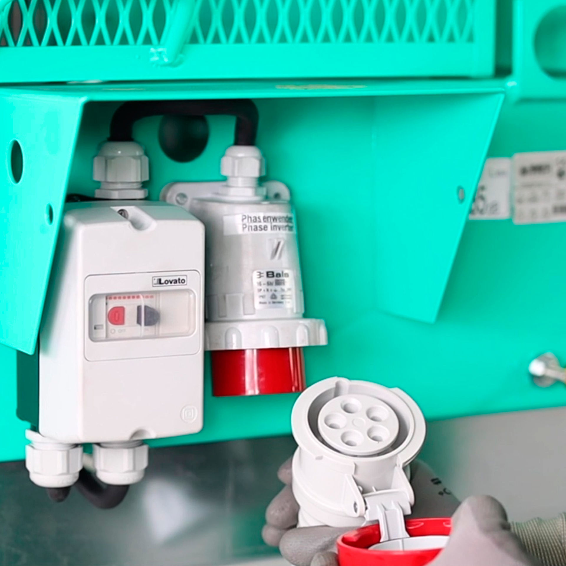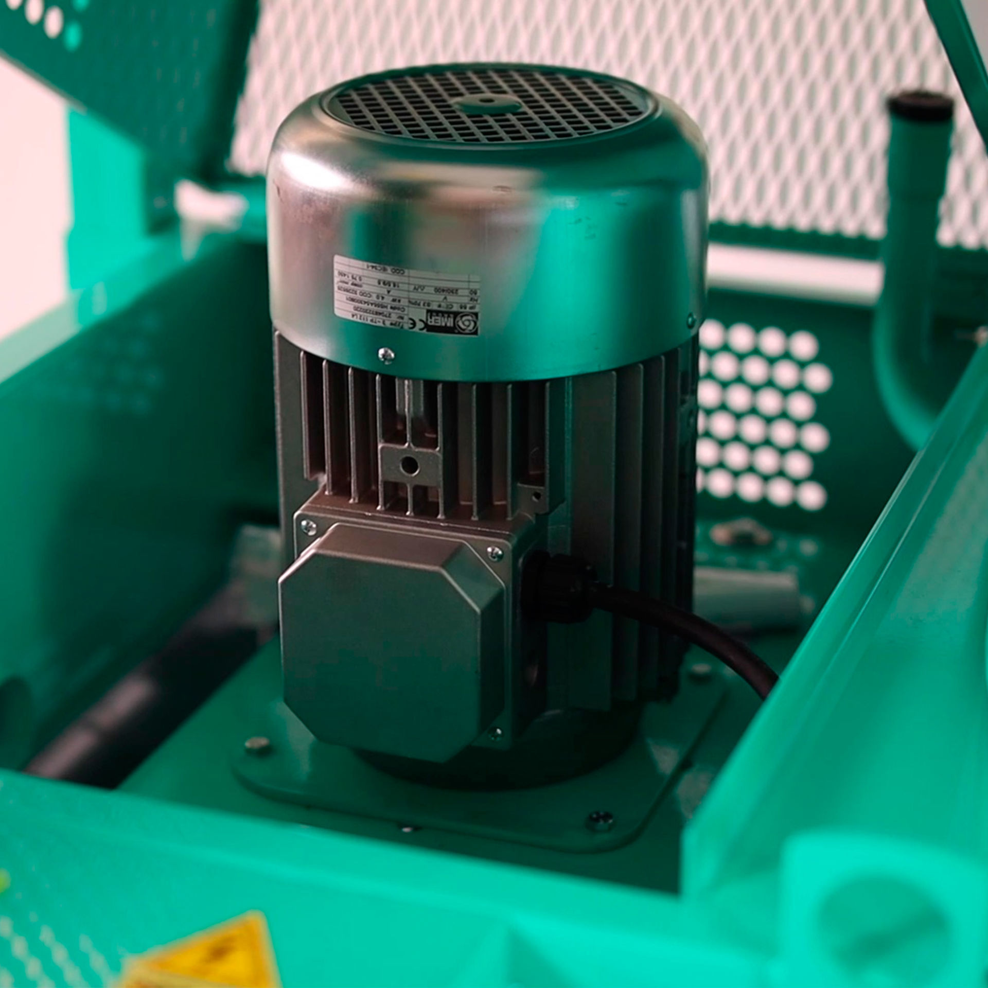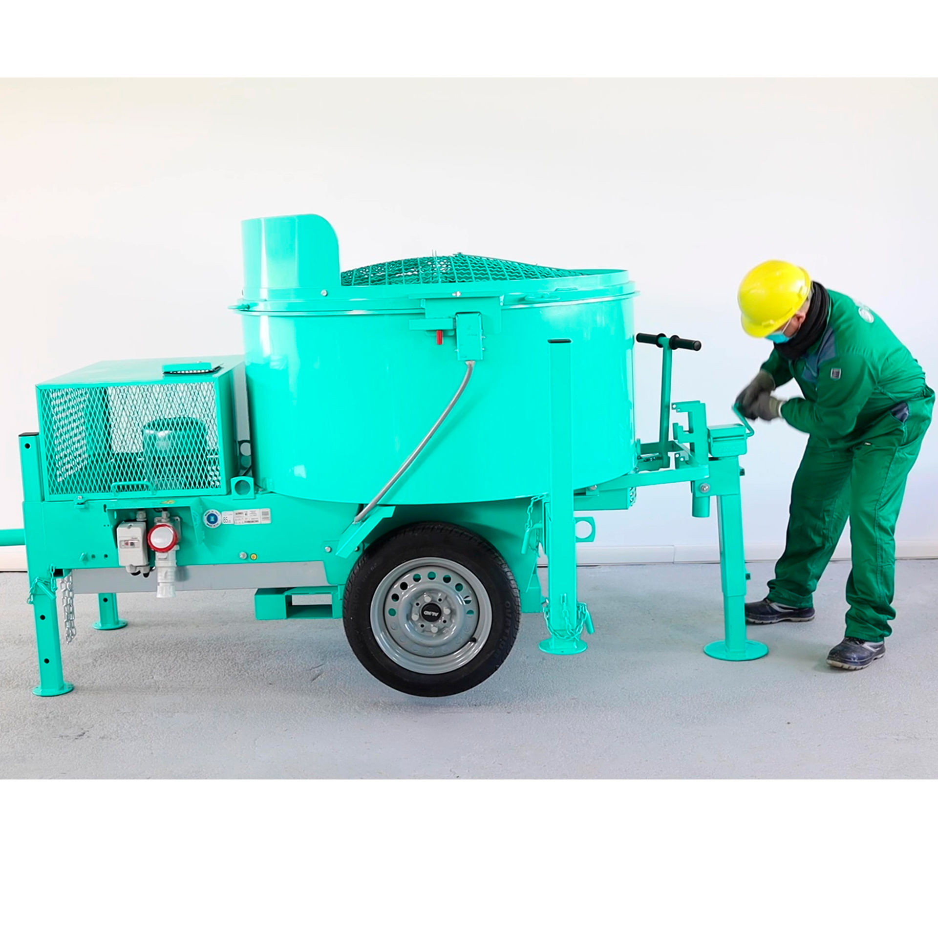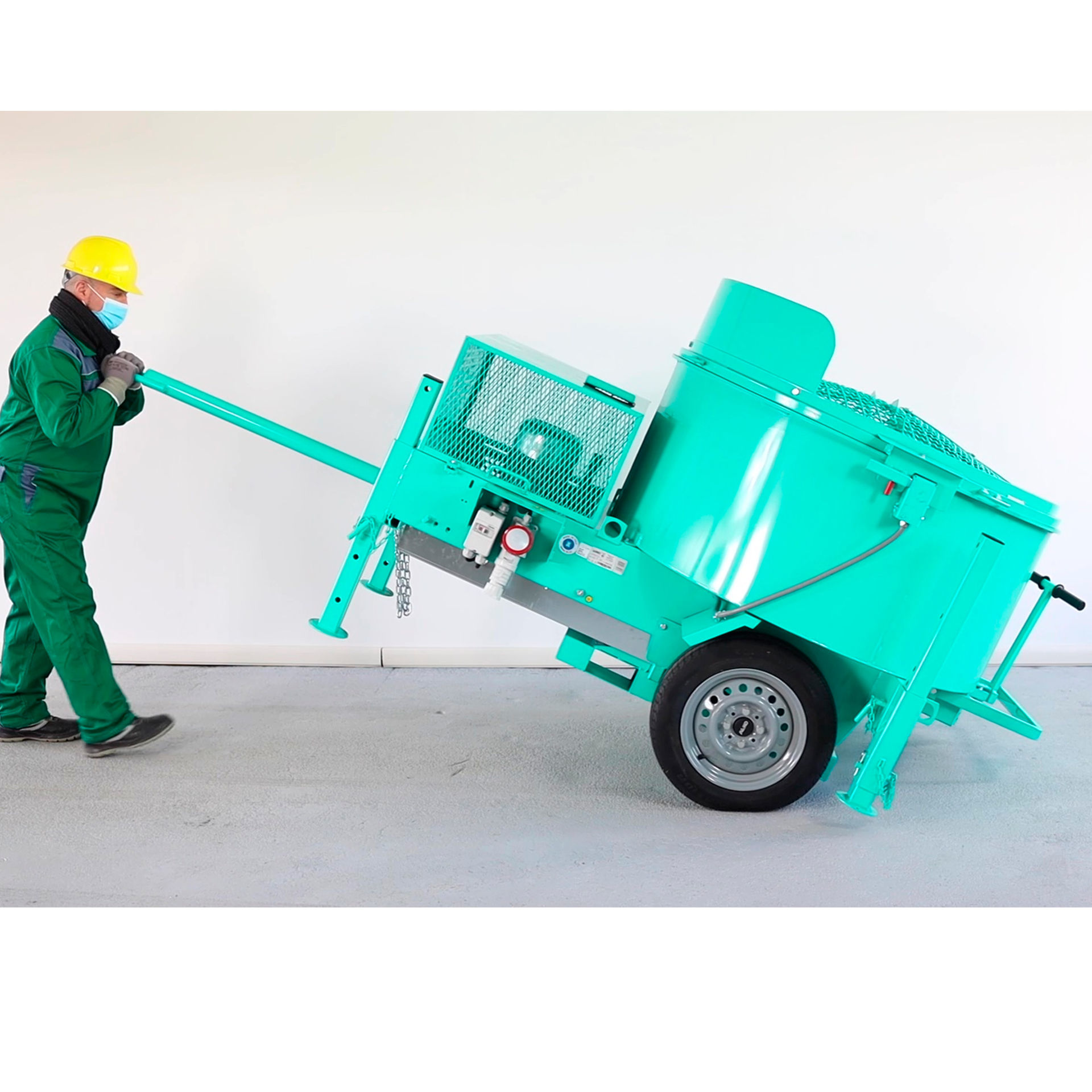 Mezcladora de mortero planetaria profesional con 750 litros de capacidad, motor trifásico de 4 kW, alta maniobrabilidad y sistema PAT “Push And Turn” de cierre hermético, fácil y seguro.