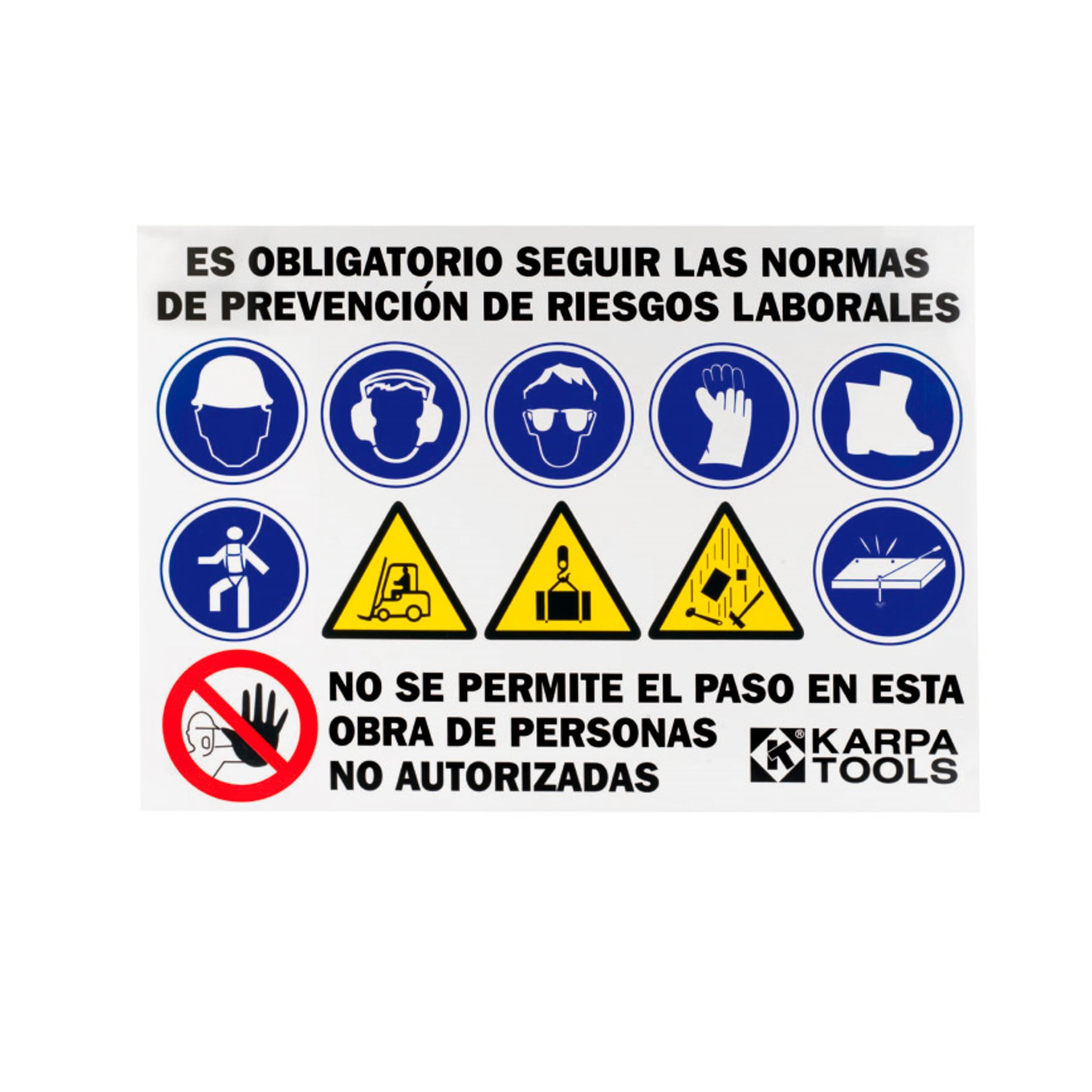 Cartel de PVC indicativo de normas de seguridad obligatorias en la obra.