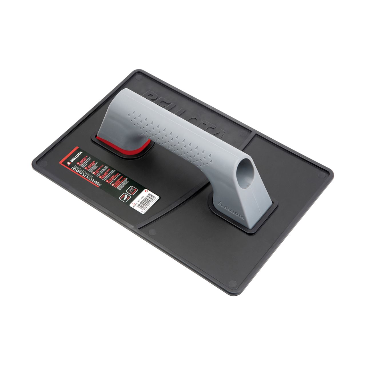 Talocha rectangular de plástico con base almenada para realizar trabajos de acabado en superficies de cemento, mortero y otros materiales.