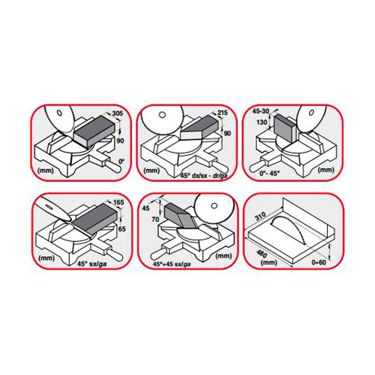 Incluye: disco con inserciones en Widia, mordaza vertical, extensiones laterales, protección de disco, llaves en dotación y accesorio para empujar la madera.